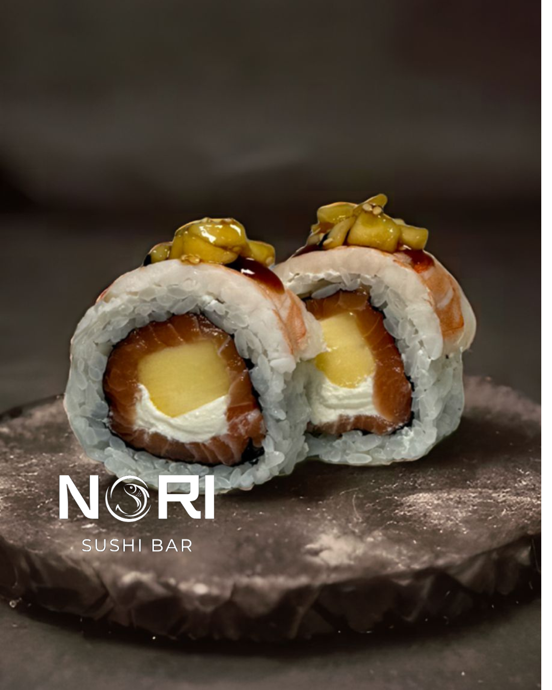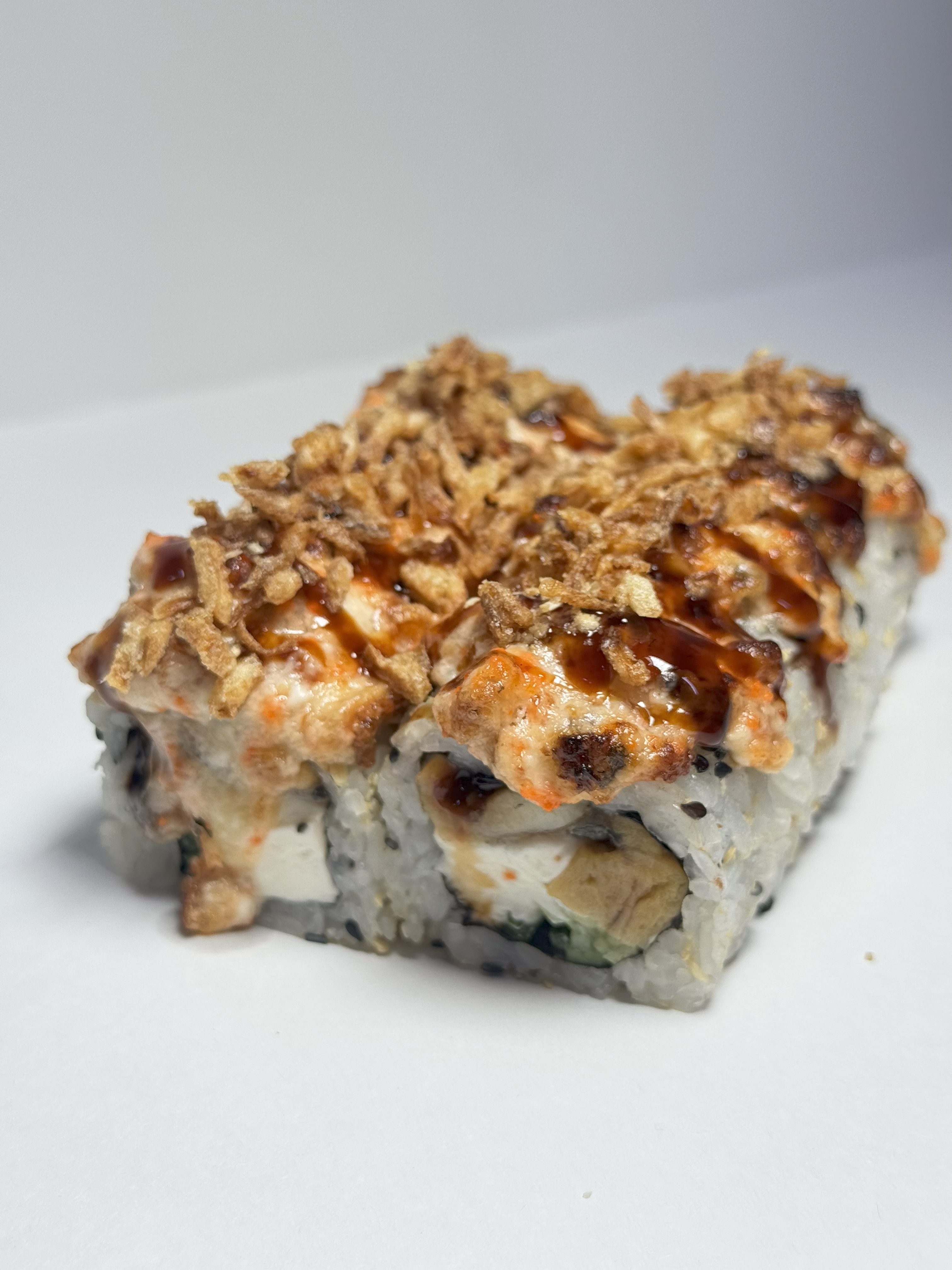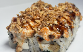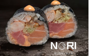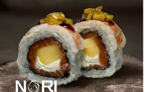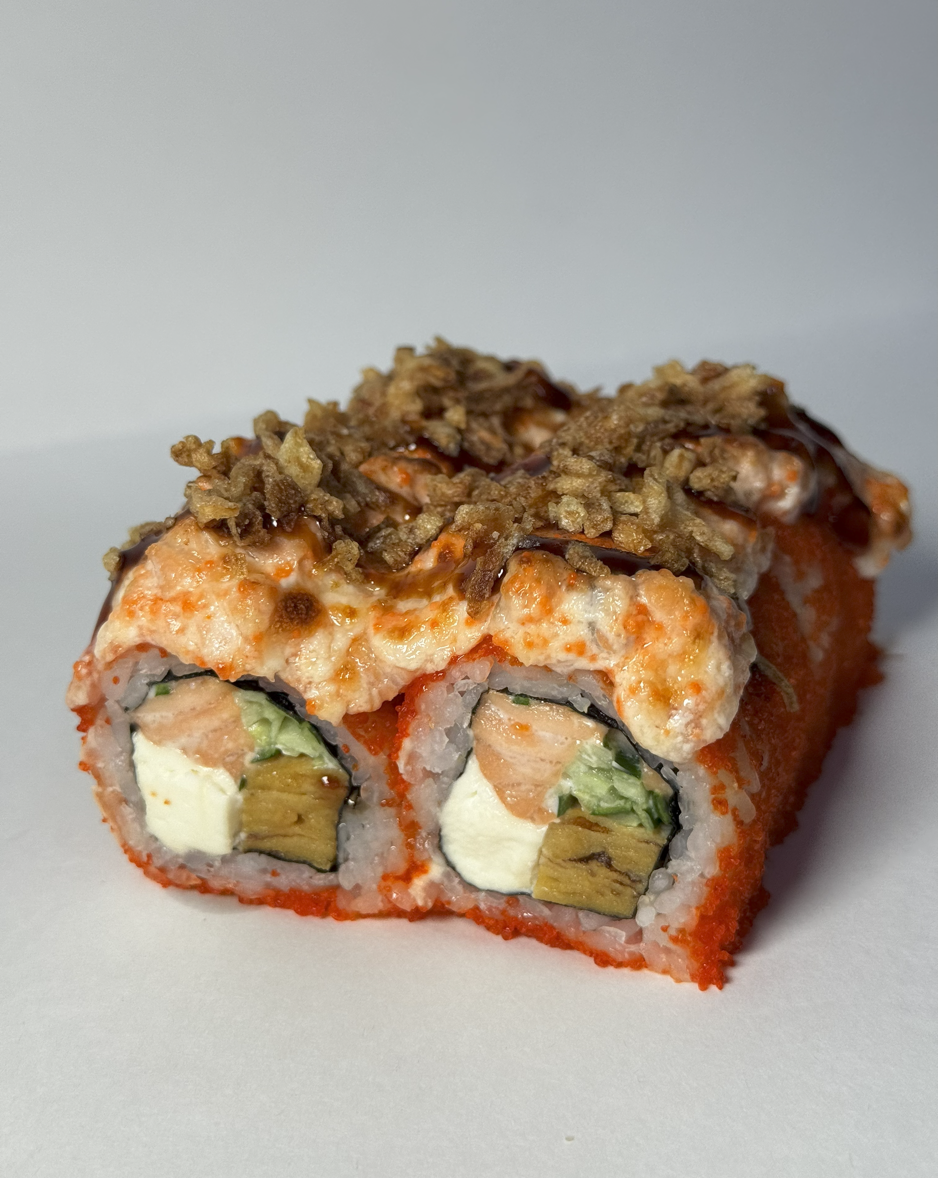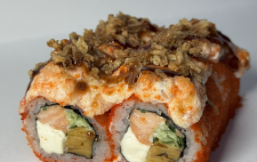 270гр 6шт(креветка, лосось, тамаго, сыр, огурец, миндаль, соус спайс, тобико)