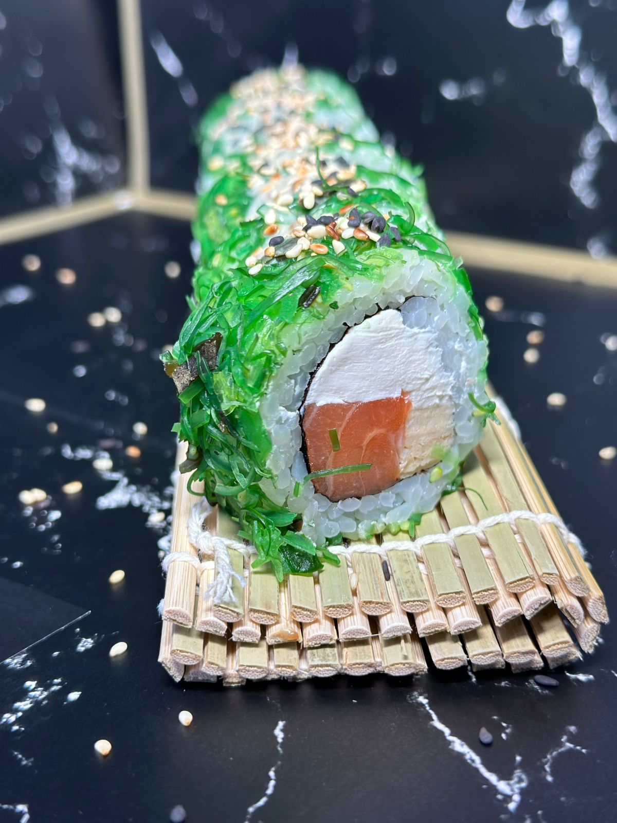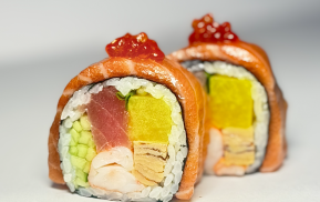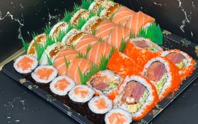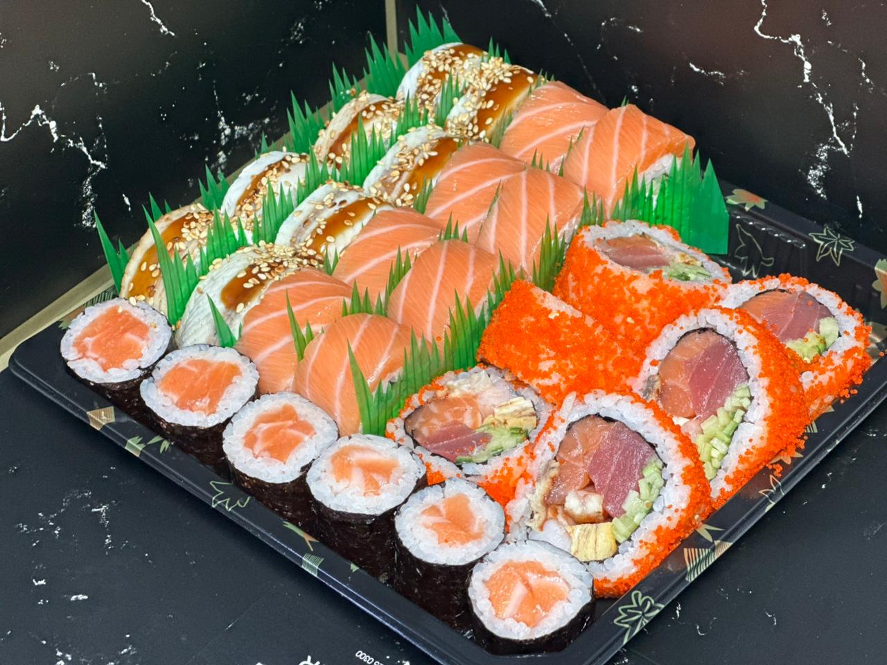 (угорь, лосось, тунец,креветка, краб Камчатский, тамаго, огурец, авокадо, тобико)